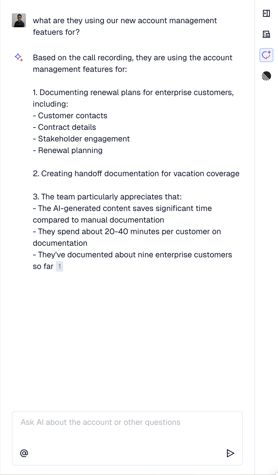 Ask AI allows you to ask open-ended questions to help answer questions about any account. All answers will also pull up citations to related content.