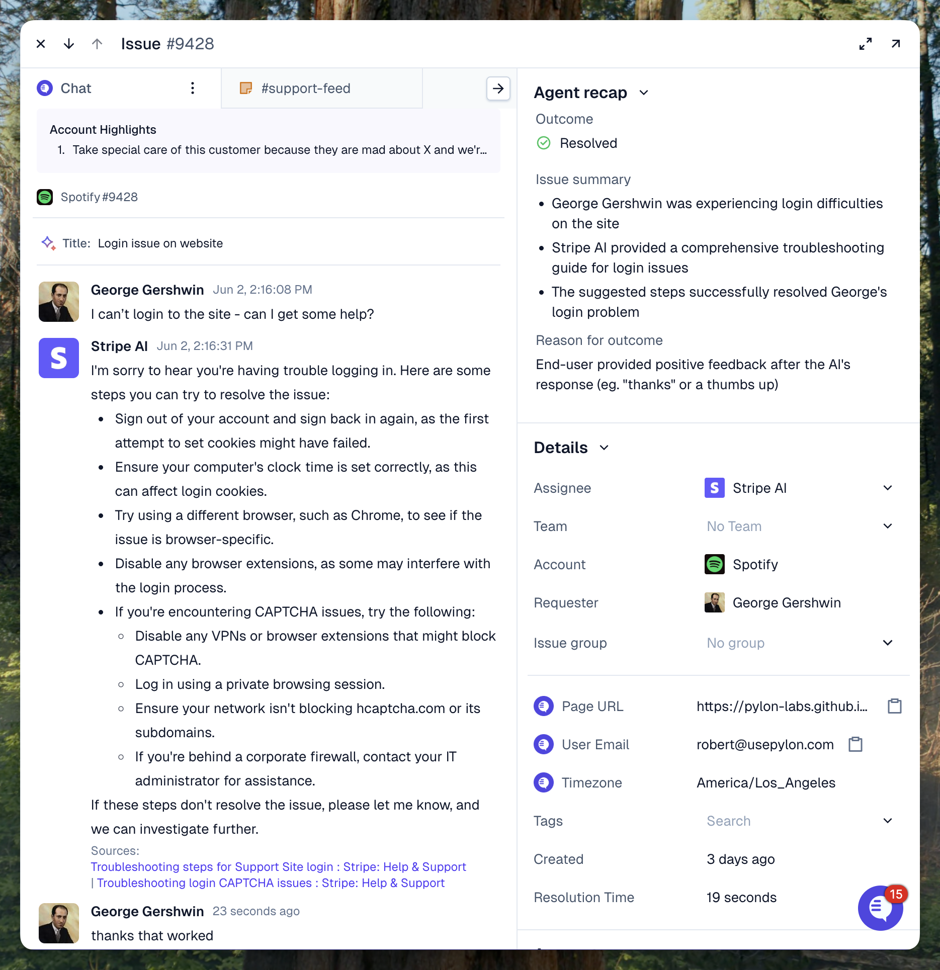 The issue log allows you to inspect all the issues the AI agent is associated with and inspect the outcomes and steps taken by the AI. You can use this to identify where the AI can be improved or better tuned.