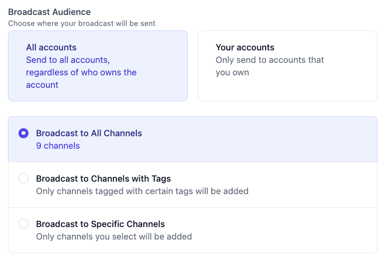 The first audience filter is choosing to send to All Accounts vs Your Accounts. You own an account if you are the Account Owner. You can see and edit this information on the Accounts Page.