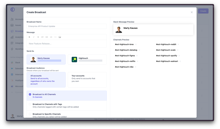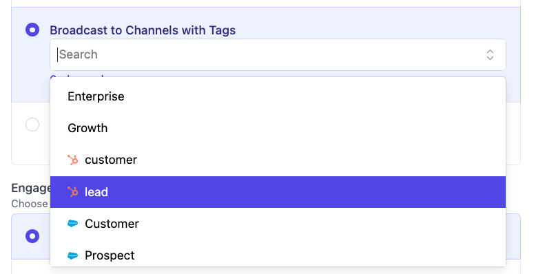 You can choose to send a Broadcast to only channels that have a certain tag. Tags can either be set in Pylon on the Accounts Page or come from your CRM. Connect your CRM.