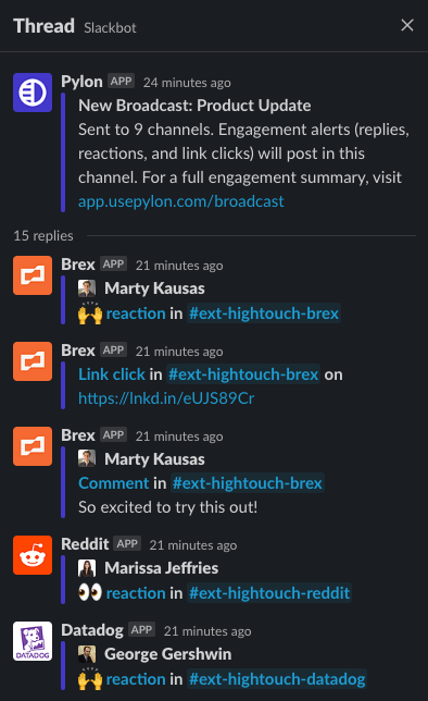 After sending your Broadcast, Pylon will live track all engagements on your messages across all channels including link clicks, reactions, and replies. These can be viewed in Pylon, or made easily visible in Slack for others to see as well.