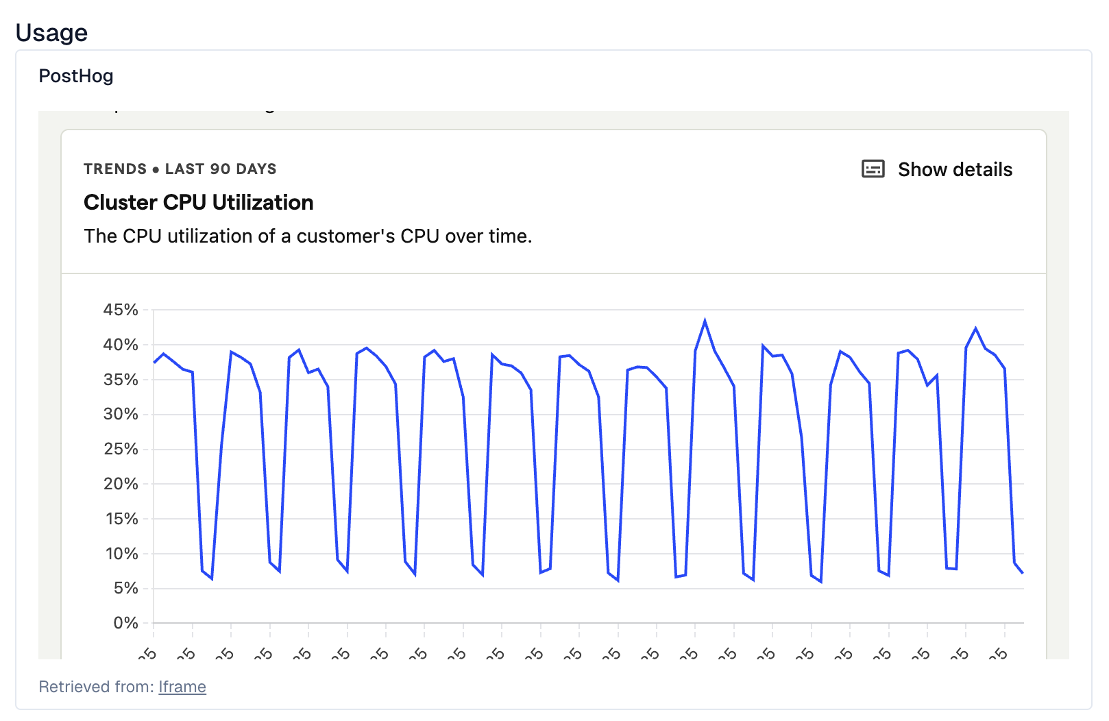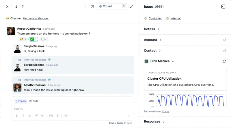 Within the issue view, embed graphs, tables, internal dashboards, etc. from any webpage that supports embeddings, or build your own webpage and embed it.