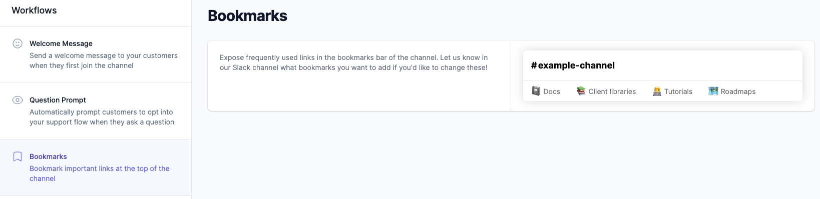 Automatically set bookmarks for Pylon enabled customer channels. These show up in the Bookmarks section of the Slack channel, accessible via. the header bar of the channel.
