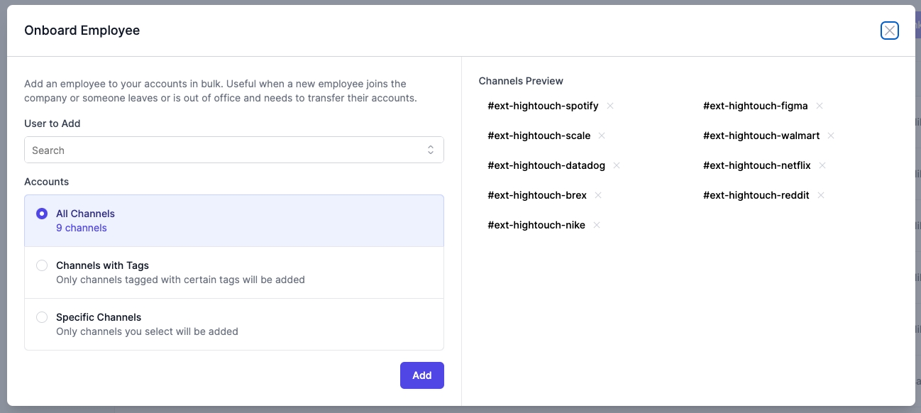 You can do this by going to the Users Page and clicking Add Employees to Channels