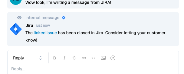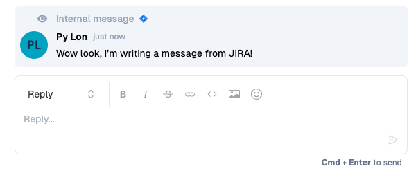 Comments in Jira sync as internal notes to Pylon and comments on the Jira internal thread from Pylon sync back to Jira as comments on the ticket.